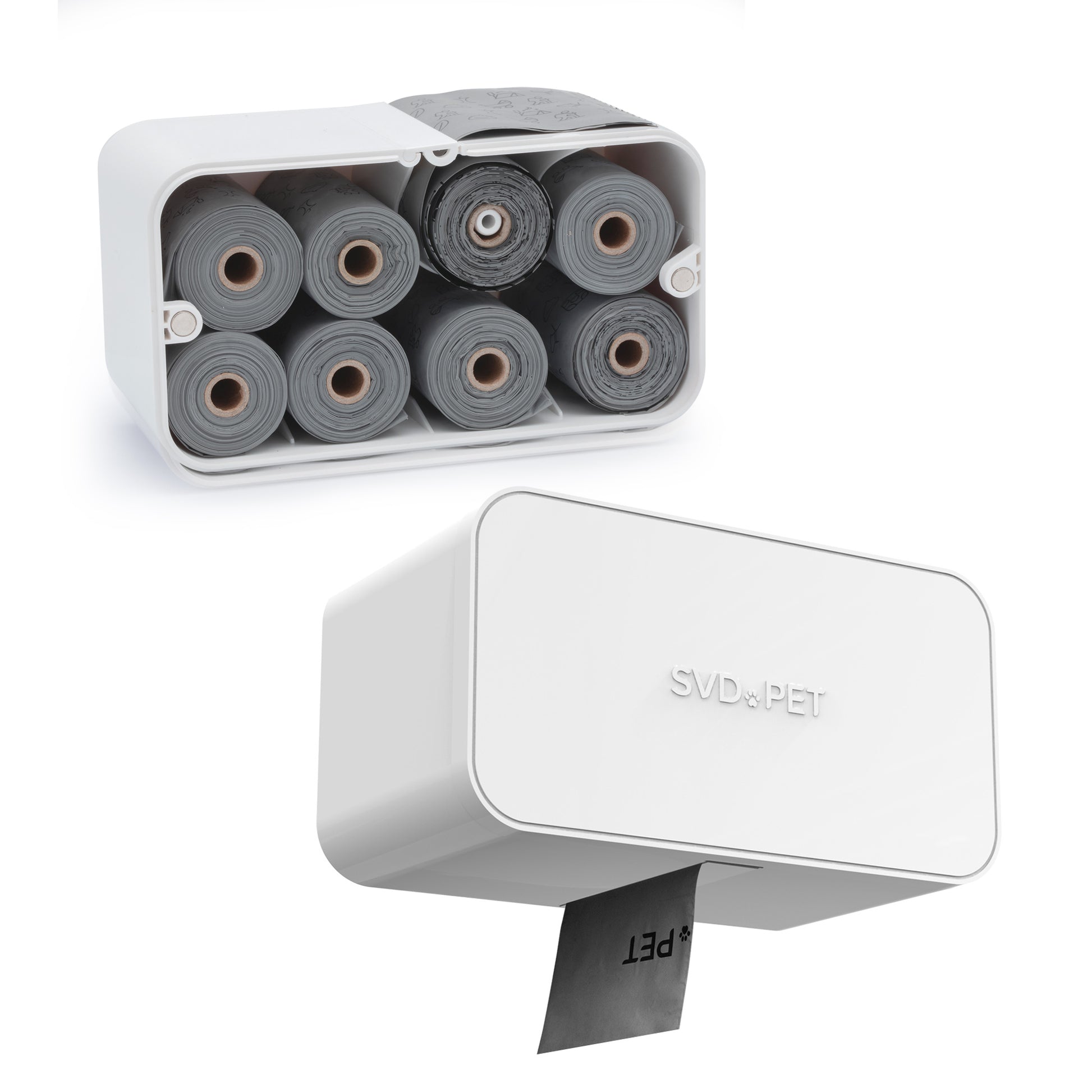 The storage station is made of all-weather plastic and ideal for extended OUTDOOR or INDOOR use. The rainproof design will keep the contents dry. Mount the storage station on the wall, secure it with adhesives, or place it directly on the table. The magnetic lid is easy to open and close even when your hands are full. This dispenser keeps things neat and tidy at home, at the doggie day care, or the vet office. Use it to store your dog poop bags or small pet items.